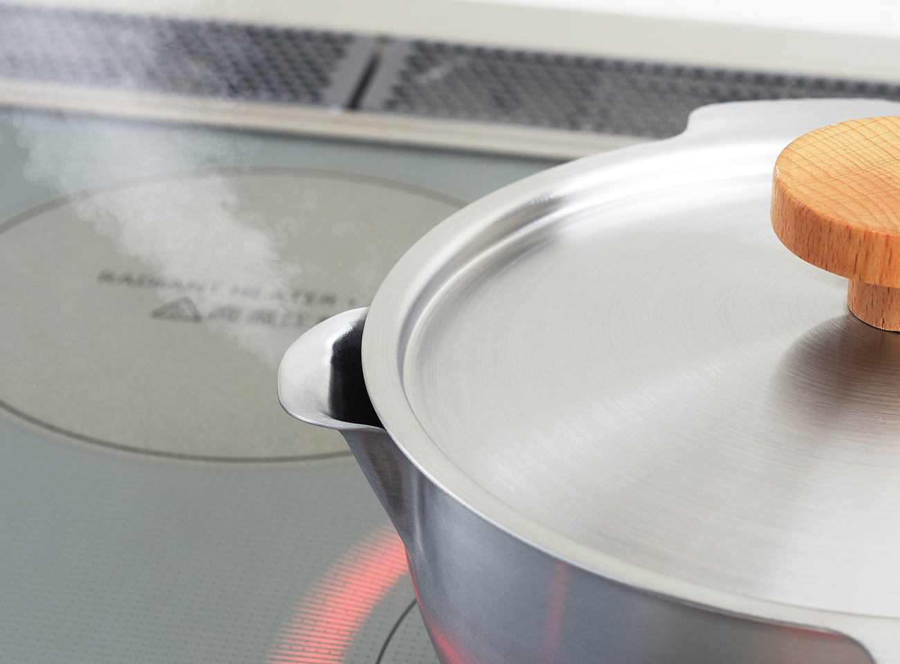 蓋は蒸気をコントロール 蓋は鍋のラインに添わせた形状です。スライドさせて、注ぎ口を開けることで蒸気を逃がし、吹きこぼれを防止します。